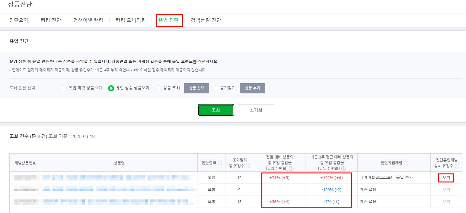 진단 요약에 들어가면 위 이미지처럼 주의 상품(순위가 떨어지고 있는)과 인기 상품(순위가 올라가고 있는)을 알려줍니다.
