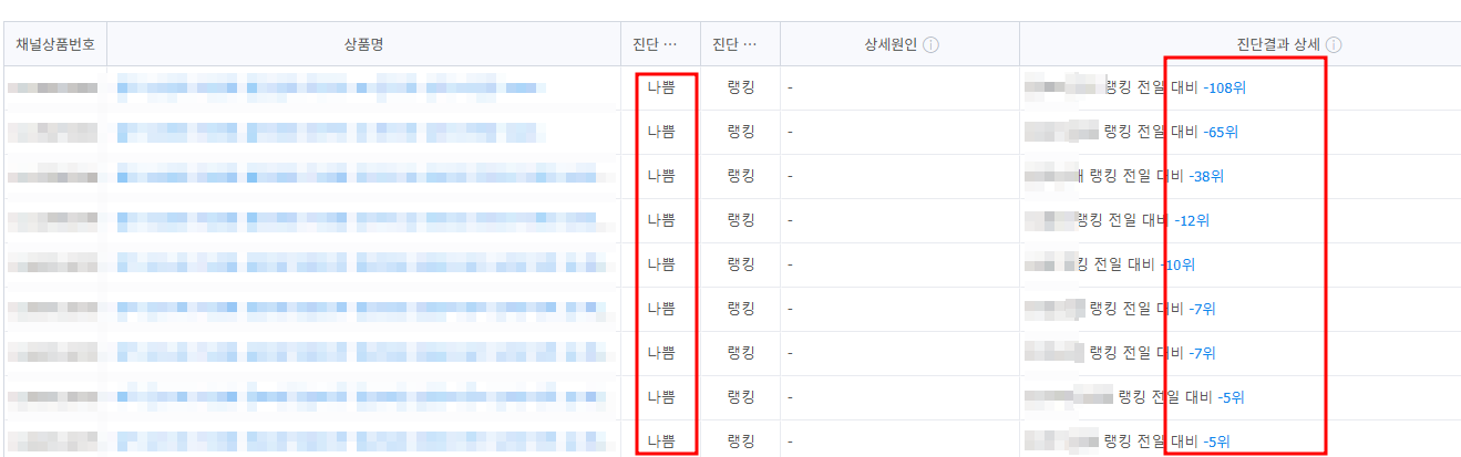 그리고 아래와 같이 진단 결과가 나쁨(순위 떨어진 경우)로 보여주며, 각각 키워드마다 어떤 키워드로 순위가 떨어지고 있는지를 표시해줍니다.