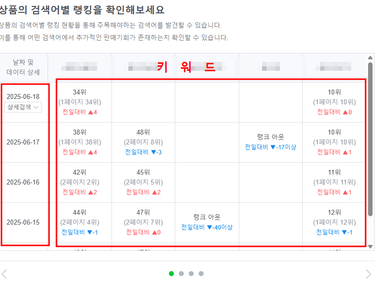 이렇게 날짜별로, 그리고 다양한 키워드별 순위 변동을 달력처럼 체크할 수 있습니다.